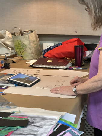 My class was about designing for tapestry. We began with a few design exercises on paper, including some work with charcoal to do some loose, free drawing. We also painted papers to cut or tear for collage. On the second day we went back to charcoal for a few gesture drawings using photos as reference.